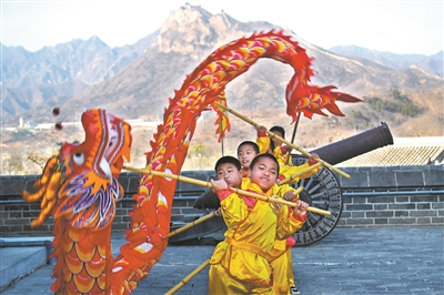 北京市密云區古北口鎮中心小學結合戍邊文化、地域文化,成立“舞龍”社團。喜愛傳統舞龍文化的學生登上長城,舞出“堅毅”精神,舞出時代風采,舞出民族自豪。樊世剛 攝