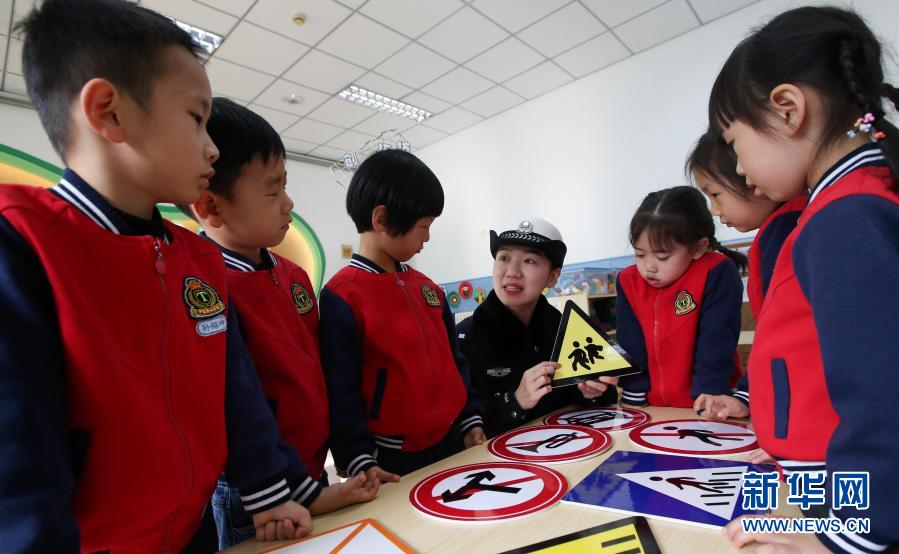 11月30日,交警在位于濟南市的山東省實驗幼兒園南校區(qū)指導孩子們識別交通安全標識牌。新華社發(fā)(郝群英 攝)