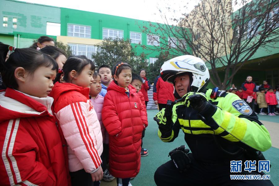 11月30日,在位于濟南市的山東省實驗幼兒園南校區(qū),交警向孩子們展示執(zhí)法記錄儀。新華社發(fā)(郝群英 攝)