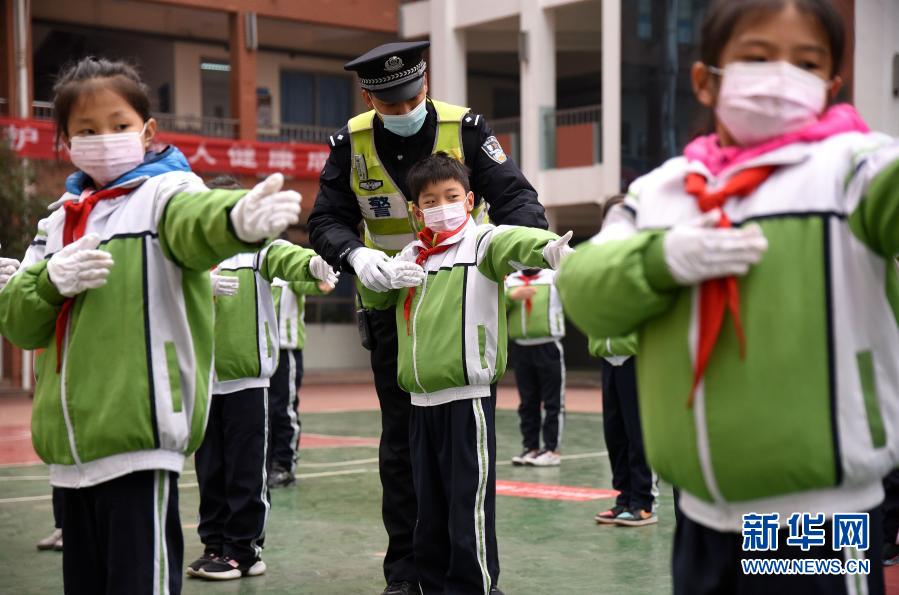 11月30日,河北省邯鄲市公安局交巡警支隊叢臺一大隊的民警在指導叢臺小學的學生們學習交通指揮手勢。新華社發(fā)(郝群英 攝)
