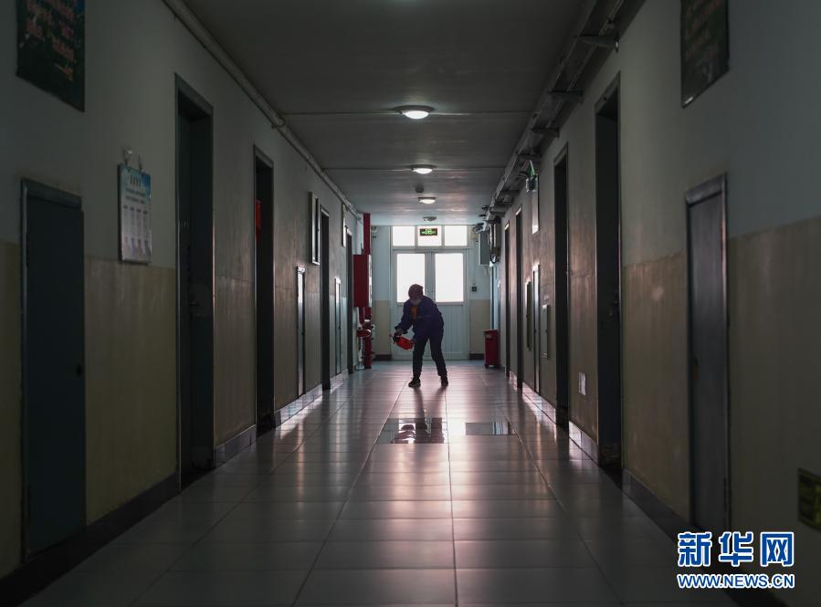 2月8日,工作人員在北京交通大學22號公寓樓道內進行消殺。新華社記者 張浩波 攝