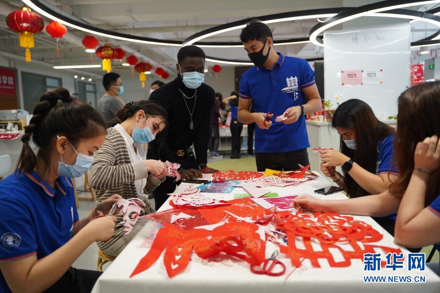 2月8日,北京交通大學留學生在體驗剪紙。新華社記者 張浩波 攝
