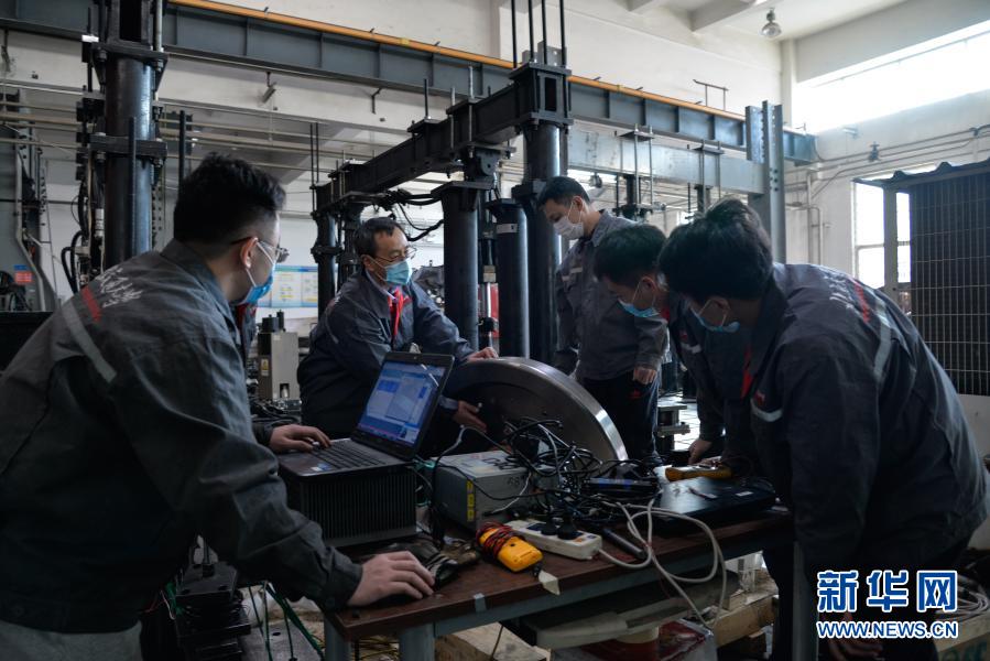 2月9日,北京交通大學教師和學生在結構強度檢測實驗室一起研討高速列車輪軸結構可靠性。新華社記者 徐欽 攝
