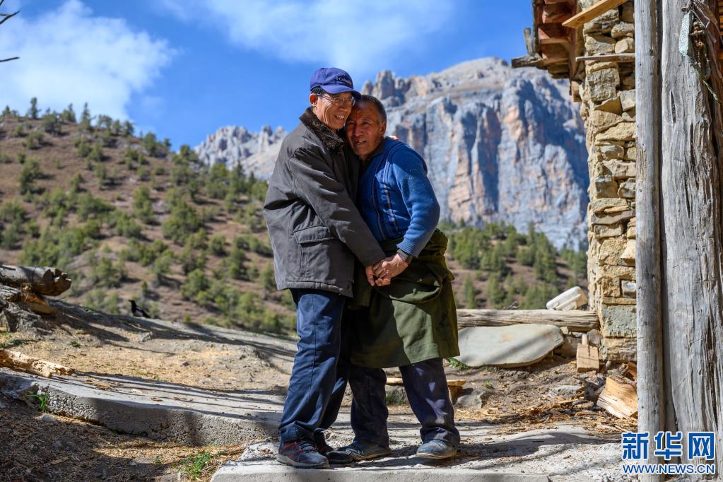 5月3日,李純民前往西藏昌都市類烏齊縣伊日鄉崩日村看望1979年下鄉工作時結識的房東一家。這是房東的大兒子澤仁多加(右)在家門口熱情歡迎他。新華社記者 劉金海 攝