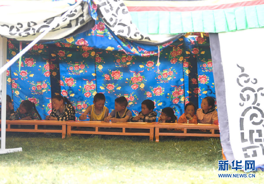 8月2日,在青海省果洛藏族自治州瑪沁縣下大武鄉年扎村“育苗加油站”的帳篷里,小朋友們在進行繪畫。新華社記者 張龍 攝