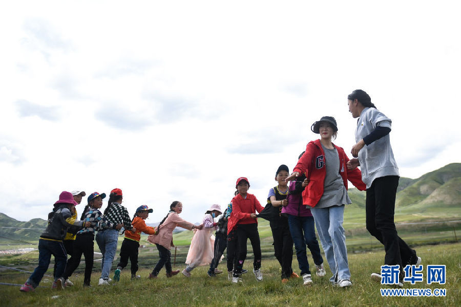 8月2日,在青海省果洛藏族自治州瑪沁縣下大武鄉年扎村的“育苗加油站”,孩子們在一起玩游戲。新華社記者 張龍 攝