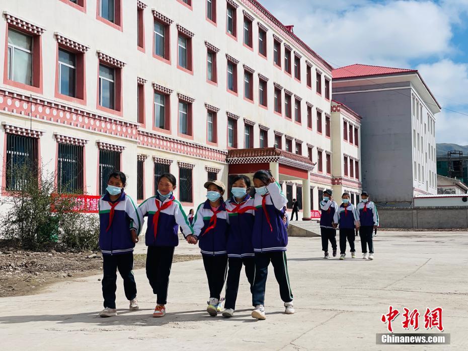 9月1日,青海省果洛藏族自治州瑪多縣地震災(zāi)后過(guò)渡安置一校區(qū)的同學(xué)們迎來(lái)了新學(xué)期。圖為學(xué)生們下課后走出教學(xué)樓。為確保青海瑪多全縣中小學(xué)(幼兒園)學(xué)生秋季正常開學(xué),該縣對(duì)災(zāi)區(qū)2933名學(xué)生、322名教職工分批次過(guò)渡安置到青海省果洛全州各校以及青海省三江源民族中學(xué)就學(xué)。 中新社記者 孫睿 攝