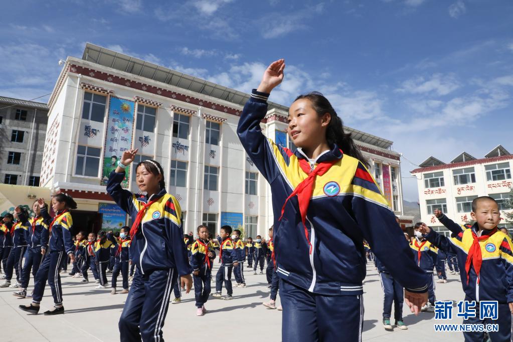 9月2日,黃南藏族自治州同仁市熱貢藝術完全小學的學生在跳“鍋莊”課間操。新華社記者 馬千里 攝