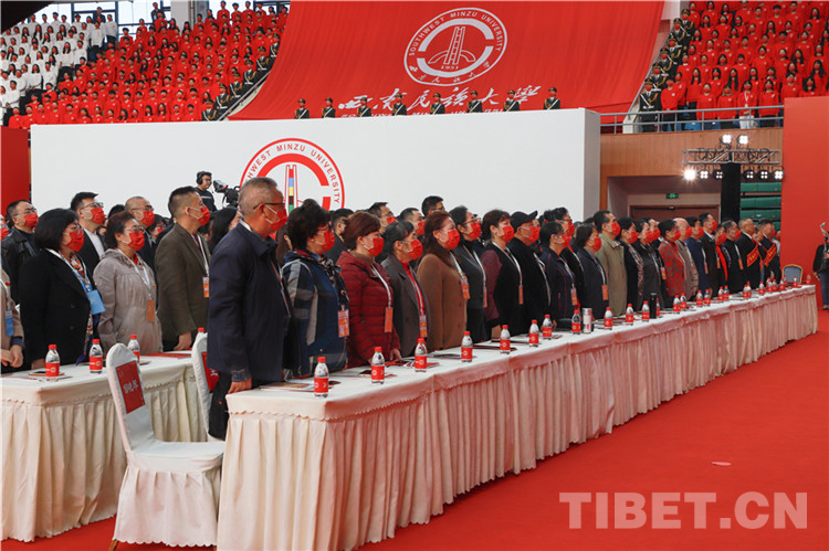 大會(huì)在雄壯的國(guó)歌聲中拉開帷幕,西南民族大學(xué)黨委書記楊敏宣布慶祝大會(huì)開始。