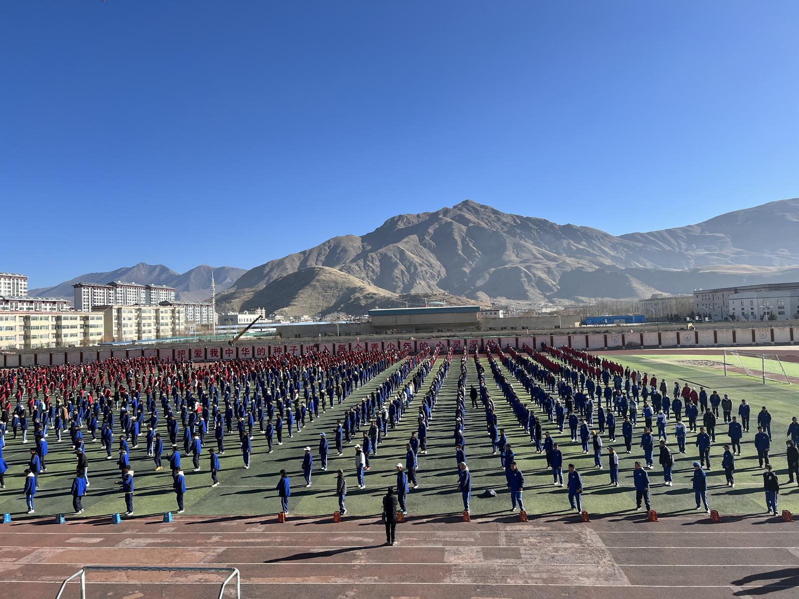 圖為全校學生正在做“鍋莊舞”課間操。