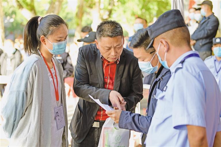 圖為拉薩中學(xué)考點(diǎn)門(mén)前,民警正在為考生家長(zhǎng)提供幫助。記者 唐斌 攝