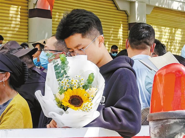 圖為家長(zhǎng)手捧向日葵在考點(diǎn)外等候考生。記者 王莉 攝
