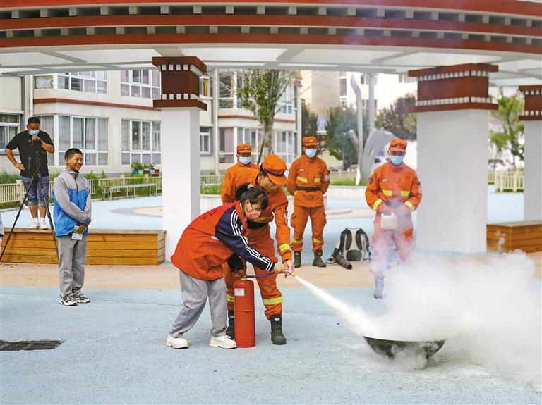 圖為消防員教學生使用滅火器。記者 張猛 王珊 謝筱純 攝