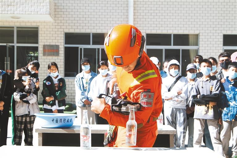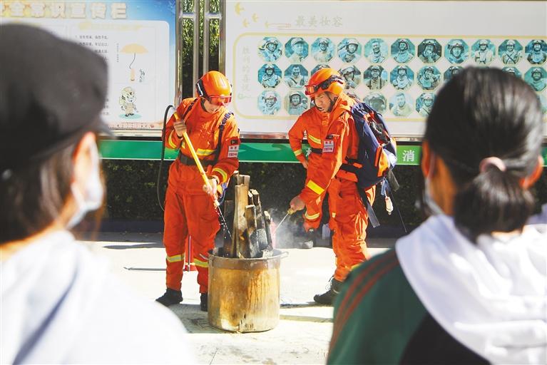消防員就裝備正確使用方法進(jìn)行演示。通訊員 徐嘉陽 記者 謝筱純 王珊 張猛 攝