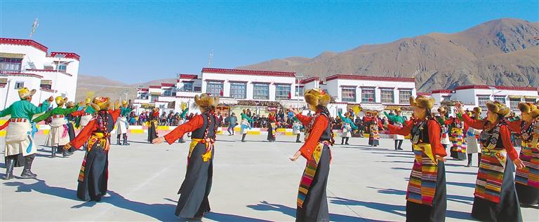 文藝事業(yè)繁榮興盛,全區(qū)共有10個(gè)專業(yè)文藝團(tuán)體、76個(gè)縣區(qū)藝術(shù)團(tuán)、153個(gè)民間藏戲隊(duì)、395個(gè)鄉(xiāng)鎮(zhèn)文藝演出隊(duì),所有行政村成立群眾文藝演出隊(duì)。圖為西藏自治區(qū)扎囊縣德吉新村群眾文藝演出隊(duì)開展演出活動(dòng)。