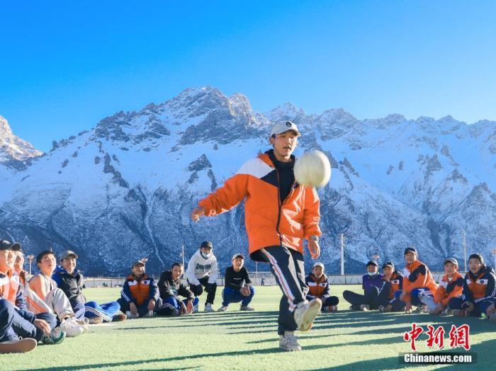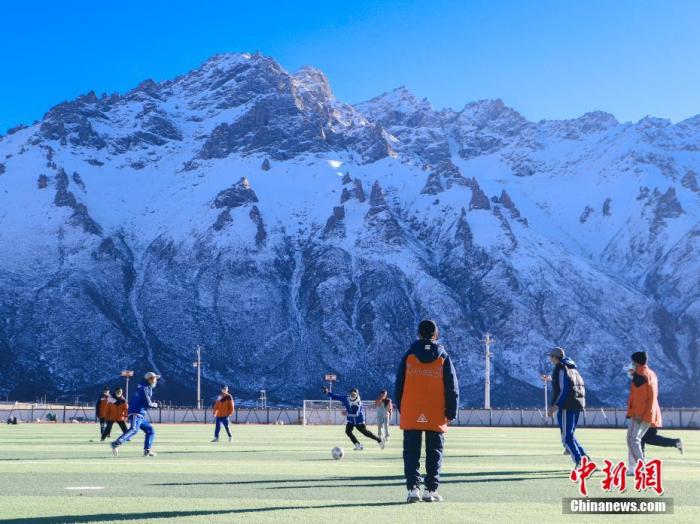 圖為11月25日,西藏那曲市嘉黎縣中學學生們在“雪山下的夢幻足球場”上進行足球訓練。 中新社記者 貢嘎來松 攝