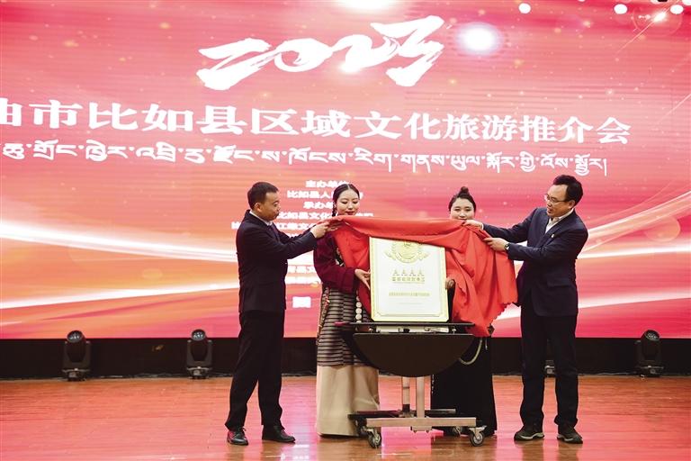 隨后,比如縣、索縣、巴青縣、嘉黎縣代表依次通過文旅資源推介向大家展現(xiàn)了不同縣區(qū)別樣的自然風光與人文風采。同時,現(xiàn)場還舉辦了比如唐蕃古道文化旅游景區(qū)國家AAAA級旅游景區(qū)揭牌儀式。