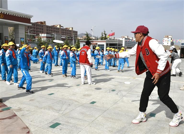 圖為學(xué)生們?cè)诮叹毜闹笇?dǎo)下進(jìn)行飛盤(pán)傳接練習(xí)。記者 旦增蘭澤 攝