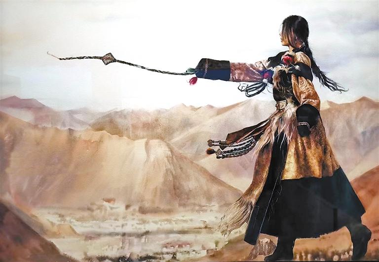 中國畫作品《幸福西藏》運(yùn)用工筆重彩的繪畫藝術(shù)表現(xiàn)形式,描繪了布達(dá)拉宮廣場(chǎng)上民族和睦的美好生活圖景。畫面中,湛藍(lán)天空下,藏族群眾與遠(yuǎn)道而來的各地游客們相聚雪域高原,燦爛的笑容映照出新時(shí)代西藏人民的美好生活,也反映出西藏自然風(fēng)光、人文風(fēng)情對(duì)各地游客的極大吸引力。從青年旅行者們或騎著單車,或舉起相機(jī)認(rèn)真拍照的表情,能深刻感受到他們對(duì)美麗西藏的向往。同時(shí),繪畫作品反映出近年來西藏旅游事業(yè)的蓬勃發(fā)展以及各族兒女團(tuán)結(jié)互助、攜手進(jìn)步的新時(shí)代美好生活景象。水彩·粉畫《颯·薩》運(yùn)用人物特寫的藝術(shù)創(chuàng)作手法,展現(xiàn)出一位西藏姑娘甩出烏爾朵的颯爽姿態(tài);油畫《藏歷新年薩迦禳祈?!芬悦骺鞜崃业纳屎嫱谐霎?dāng)?shù)孛癖娺M(jìn)行藏歷新年祈?;顒?dòng)的歡樂場(chǎng)景;油畫《中國玉麥》以紀(jì)實(shí)敘事的創(chuàng)作方式,描繪了隆子縣玉麥鄉(xiāng)卓嘎、央宗姐妹放牧守邊的故事,畫面中她們專注地懸掛國旗的樸實(shí)舉動(dòng),傳遞出高原姊妹對(duì)祖國的深愛之情。