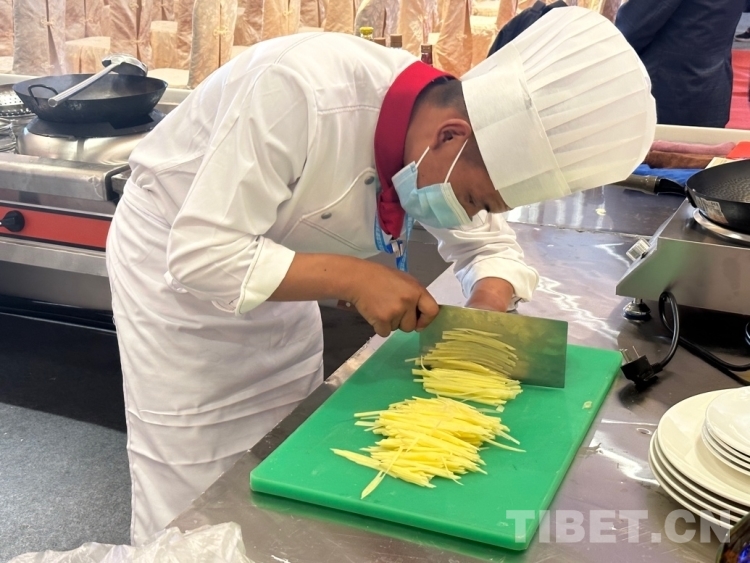 圖為來自阿里地區中等職業技術學校的參賽選手桑杰元旦在切土豆絲 攝影:旦曲