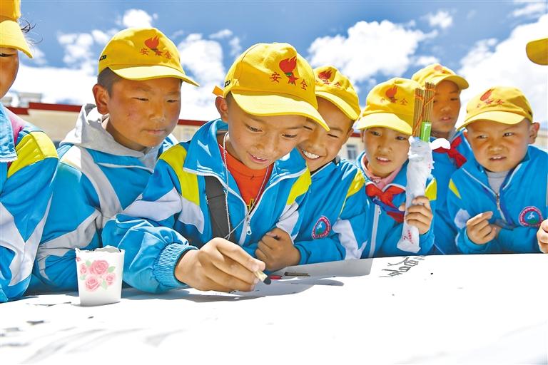 多年來,娘熱鄉完全小學充分利用課堂教育,先后推出藏戲、藏文書法等特色教育,引導學生了解、繼承和發揚優秀傳統文化,先后獲得了“第二批全國中小學中華優秀文化藝術傳承學校”“自治區級非遺示范基地”等榮譽稱號。