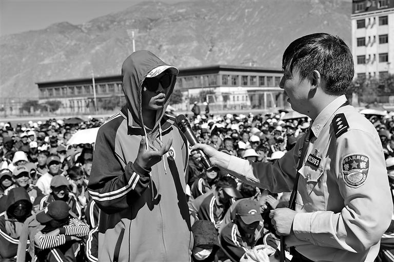 宣傳活動中,拉薩市第一中等職業技術學校學生和區公安廳網安總隊民警熱情互動。記者 彭琦 攝