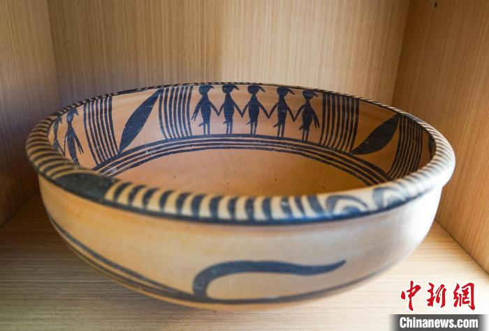 圖為中心內展出的仿制文物、出土于青海大通上孫家寨的馬家窯時期的舞蹈紋彩陶盆。馬銘言攝