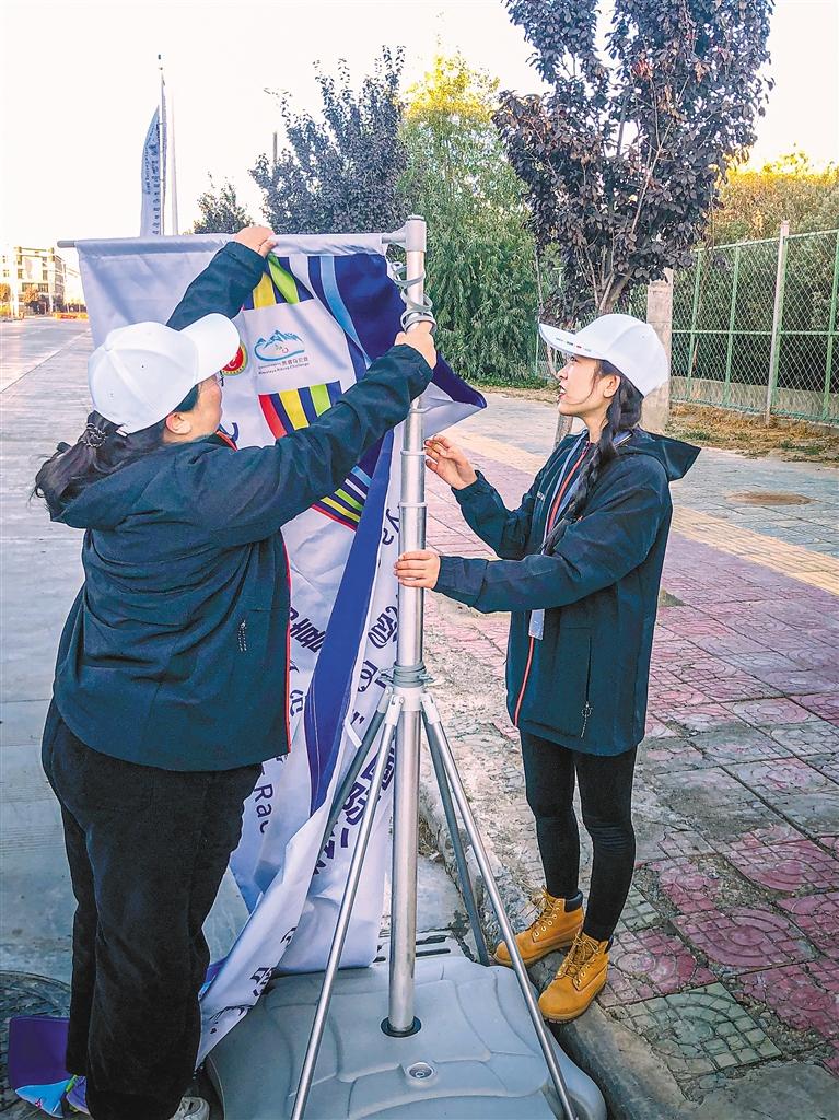 圖為志愿者在比賽起點擺放刀旗。記者 楊子彥 蔣翠蓮 攝