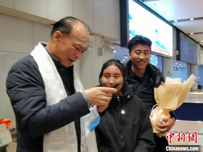 11月14日下午,來(lái)自西藏自治區(qū)昌都市的8名脊柱側(cè)彎患者到達(dá)北京首都國(guó)際機(jī)場(chǎng)。圖為北京大學(xué)第一醫(yī)院骨科主任李淳德(左)和藏族女孩澤巴央宗、哥哥貢布鄧珠交談。 徐雪瑩 攝