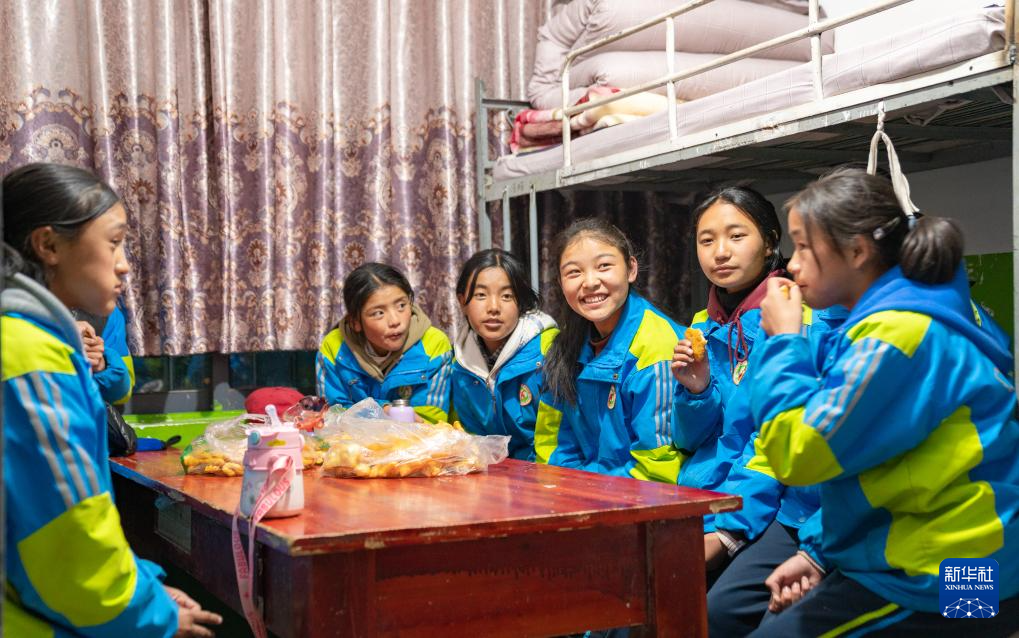 斯曲卓瑪(右三)和同宿舍的朋友一起吃零食聊天(11月9日攝)。新華社發(丁增尼達 攝)