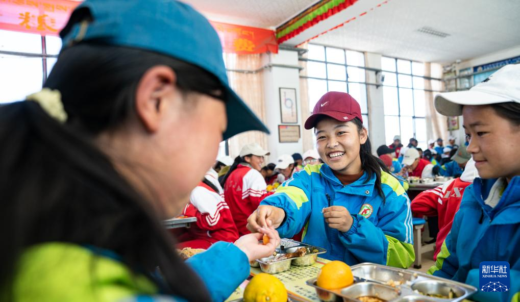 斯曲卓瑪(中)在學校吃午餐(11月10日攝)。新華社發(丁增尼達 攝)