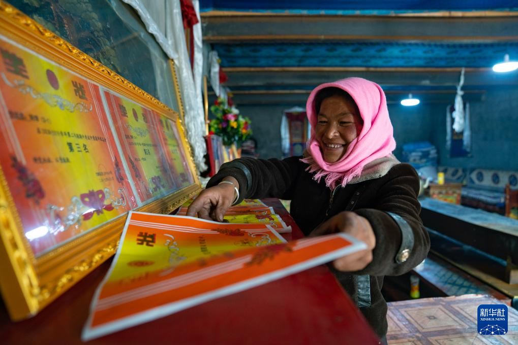 斯曲卓瑪的媽媽在整理孩子們的獎狀(11月9日攝)。新華社發(丁增尼達 攝)