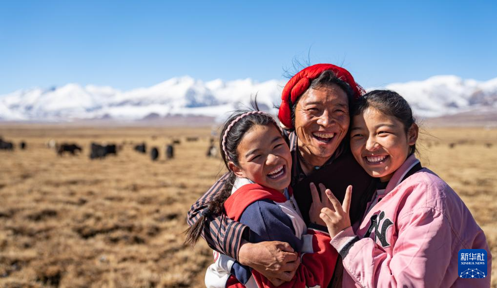 斯曲卓瑪(右)和爸爸、妹妹一起在草原上放牧間隙(11月15日攝)。新華社發(丁增尼達 攝)