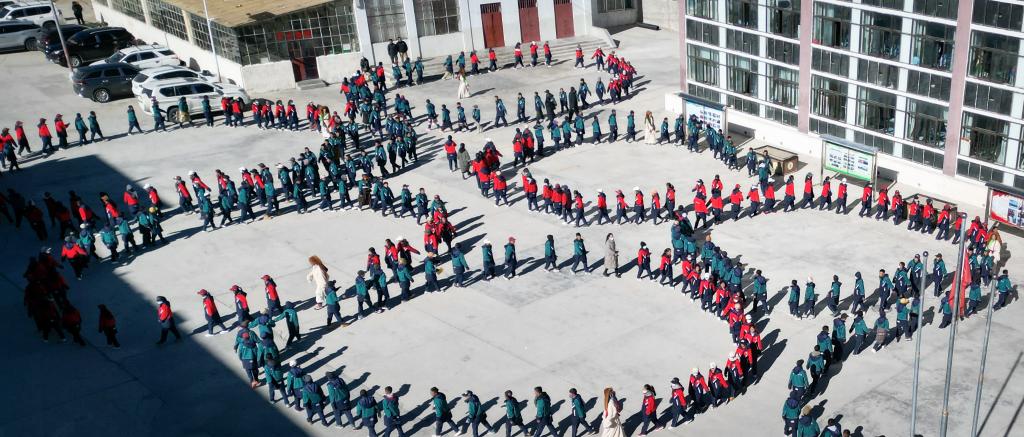 西藏阿里措勤縣中學的學生們正在跳“磁石彈舞”(無人機照片,11月13日攝)新華社記者 聶毅 攝