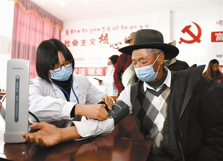 圖為拉薩市青年志愿救援隊的醫護人員為群眾測量血壓。記者 旦增蘭澤 攝