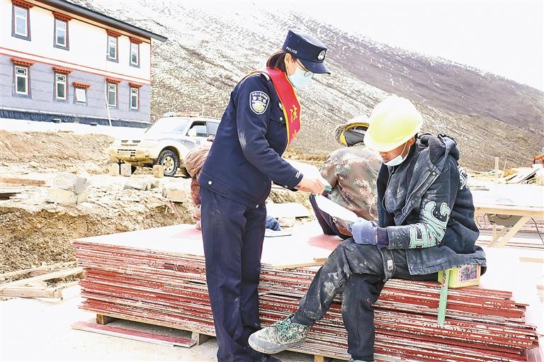 帕里邊境派出所民警在轄區工地開展憲法宣傳周普法宣傳活動,并發放憲法宣傳資料。 記者 汪純 通訊員 白瑪倉覺 攝