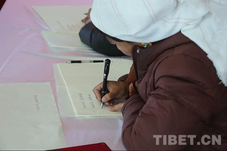 來自拉薩市當(dāng)雄縣羊八井鎮(zhèn)的仁青白姆在本次大比武中獲得了書法作品二等獎(jiǎng),她穿著一身極具當(dāng)雄特色的服飾參加今天的活動(dòng)。“我雖然沒上過學(xué),但平時(shí)忙完牧活,有機(jī)會(huì)就去上夜校學(xué)習(xí)藏語文和普通話等課程,也很喜歡利用閑暇時(shí)間在家里練習(xí)藏文書法,沒想到這次能夠獲獎(jiǎng),這是一份榮譽(yù),也是一份鼓勵(lì),我會(huì)繼續(xù)堅(jiān)持學(xué)習(xí)。”仁青白姆臉上露出甜美微笑。