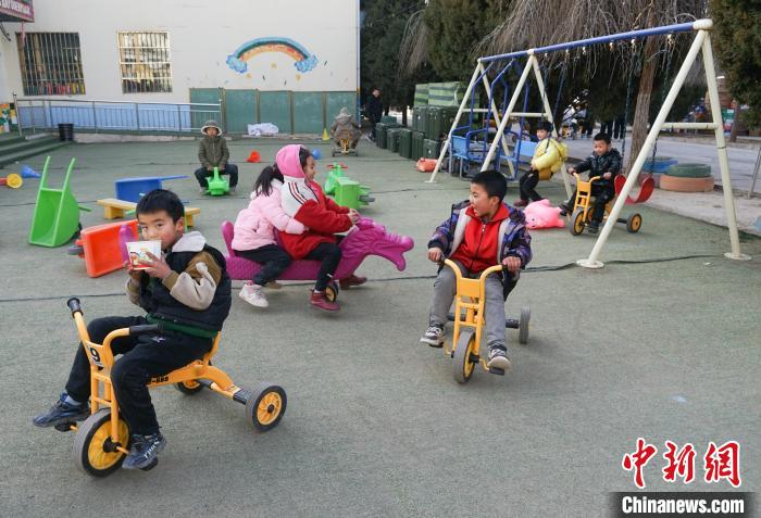 12月20日,青海省海東市民和縣中川鄉美一小學安置點內兒童嬉戲。 馬銘言 攝