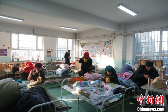 12月20日,青海省海東市民和縣中川鄉美一小學安置點內民眾正在就餐。馬銘言 攝