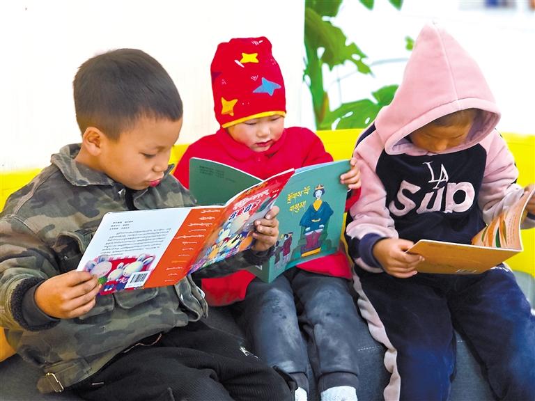 扎拉村的孩子在新時代文明實踐志愿服務(wù)隊成員的輔導(dǎo)下閱讀藏文繪本。