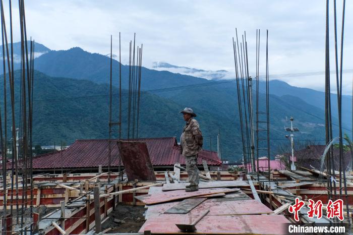 12月18日傍晚,墨脫縣門巴族村民新生在新建房屋地基上查看進度。 中新社記者 江飛波 攝