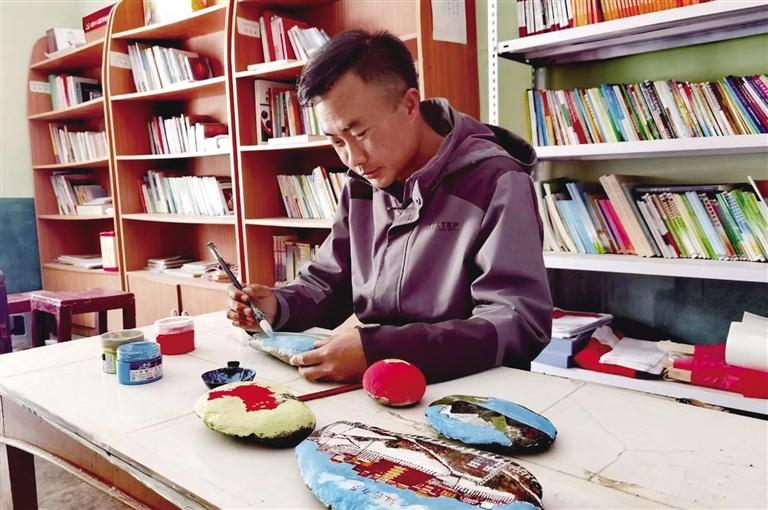 張銀波駐村期間,通過手繪石頭畫慶祝中國共產黨成立100周年。文/圖 記者 次吉