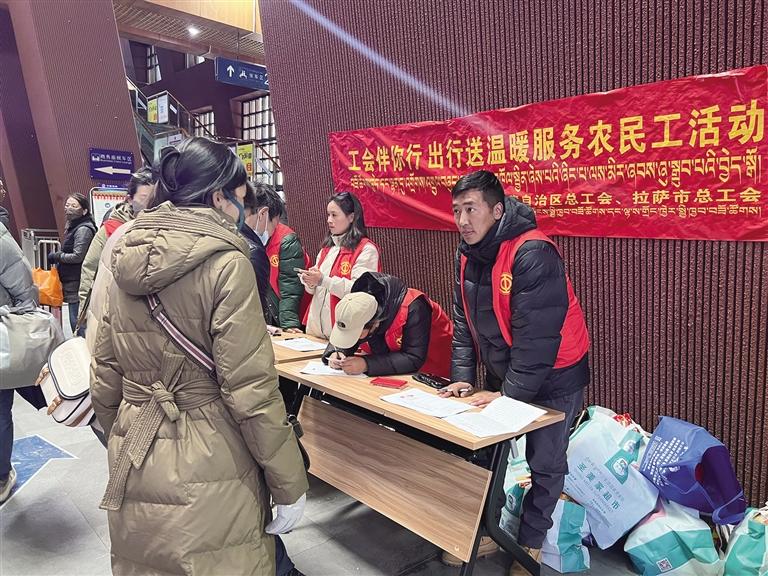 1月31日,西藏自治區總工會與拉薩市總工會聯合柳梧新區公安局應急處突大隊、中國青藏鐵路集團有限公司,在拉薩火車站內為返鄉農民工發放1000份“工會愛心大禮包”,并提供乘車咨詢、便民服務、維持秩序等服務,將工會組織的溫暖送到農民工心坎上。