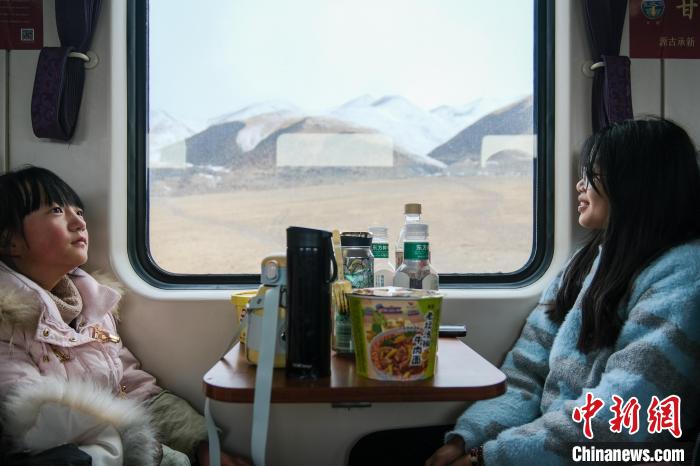 2月1日,Z166次列車上,來自廣東廣州的大學生周子茹(右)欣賞青藏鐵路沿線高原風光。 中新社記者 江飛波 攝