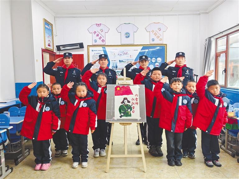 圖為玉麥邊境派出所民警、玉麥鄉小學學生與雷鋒畫像合影。通訊員 扎西根培 記者 張宇 攝