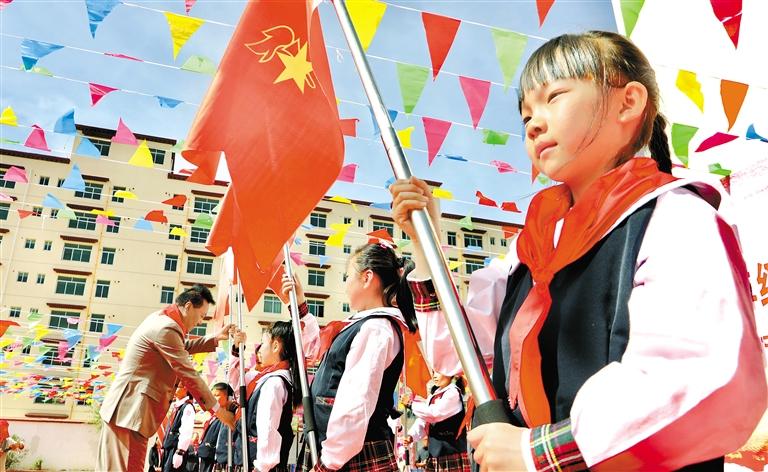5月30日,拉薩市在實驗小學東城分校舉行以“紅領巾愛祖國”為主題的一年級新隊員入隊儀式暨“紅領巾獎章”五星章頒章儀式。儀式現場,老隊員們鄭重地為新隊員佩戴紅領巾,大隊輔導員帶領新老隊員宣讀入隊誓詞,隊員們激情唱響《我們是共產主義接班人》,嘹亮的歌聲在校園回蕩。