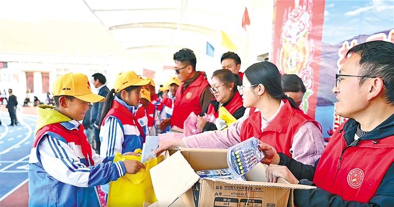 圖為志愿者在向學生們分發學習用品。記者 丹增平措 攝