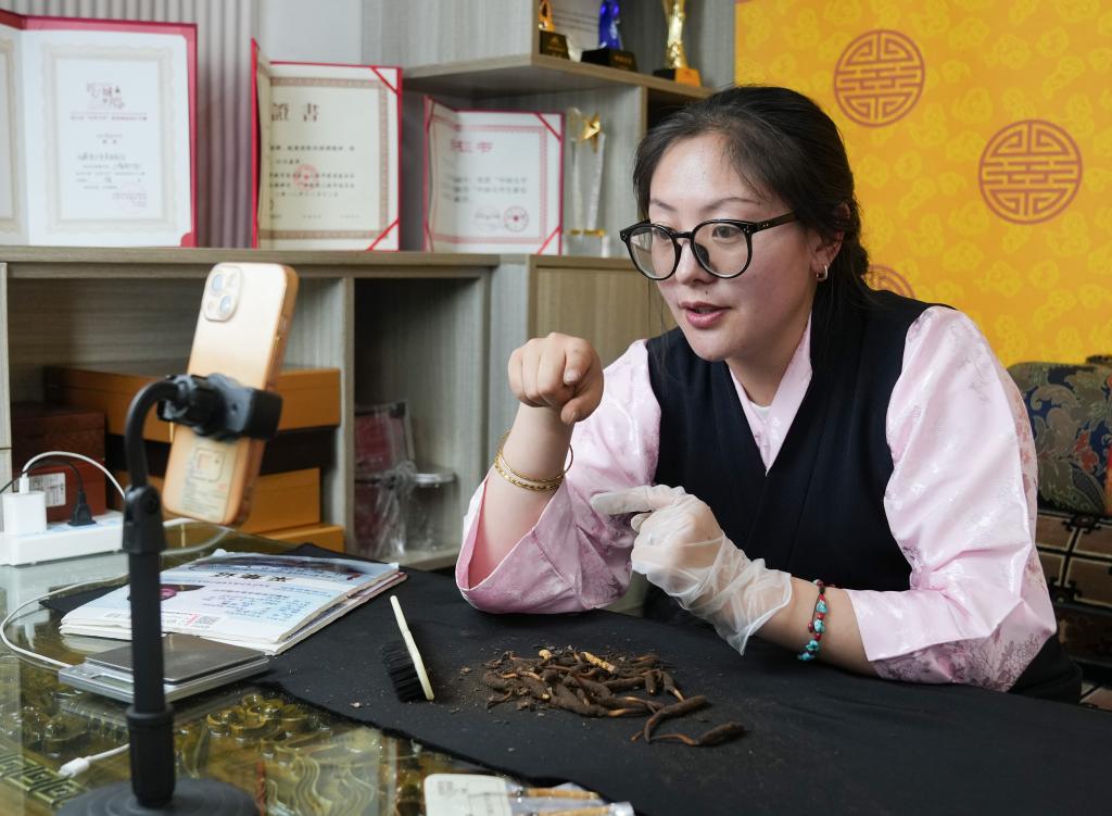 在夢譽蟲草產業帶直播基地,羅拉的妻子次仁白吉在直播帶貨(5月31日攝)。新華社記者丁汀 攝