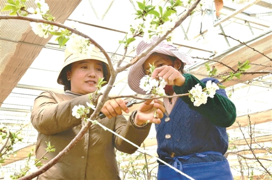 一條條有機基質槽均勻分布,一座座日光溫室拔地而起。4月是車厘子樹開花的時節,走進位于烏米組的車厘子種植大棚,就能看到車厘子花競相綻放,一簇簇白色的花朵開滿枝頭,在綠葉和枝干的映襯下,格外賞心悅目。置身于一片花海的當地務工人員正搶抓農時,為果樹疏剪花枝、人工授粉,大家各司其職、分工合作,一派熱火朝天的勞動場景。
