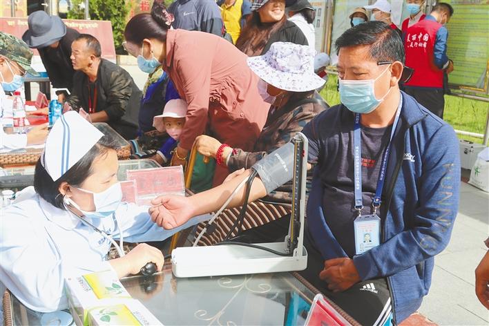 圖為武警西藏總隊醫院醫護人員為社區居民測量血壓。 金言 蔣長春 攝